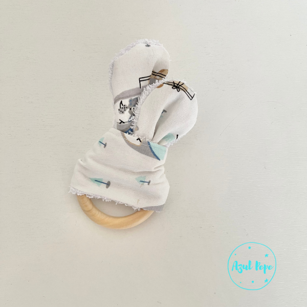 *Mordillo oreja de conejo realizado con aro de madera natural y "orejas" de tela 100% algodón y reverso de toalla super absorbente. Es ideal para aliviar las molestias producidas por las erupción de los dientes.